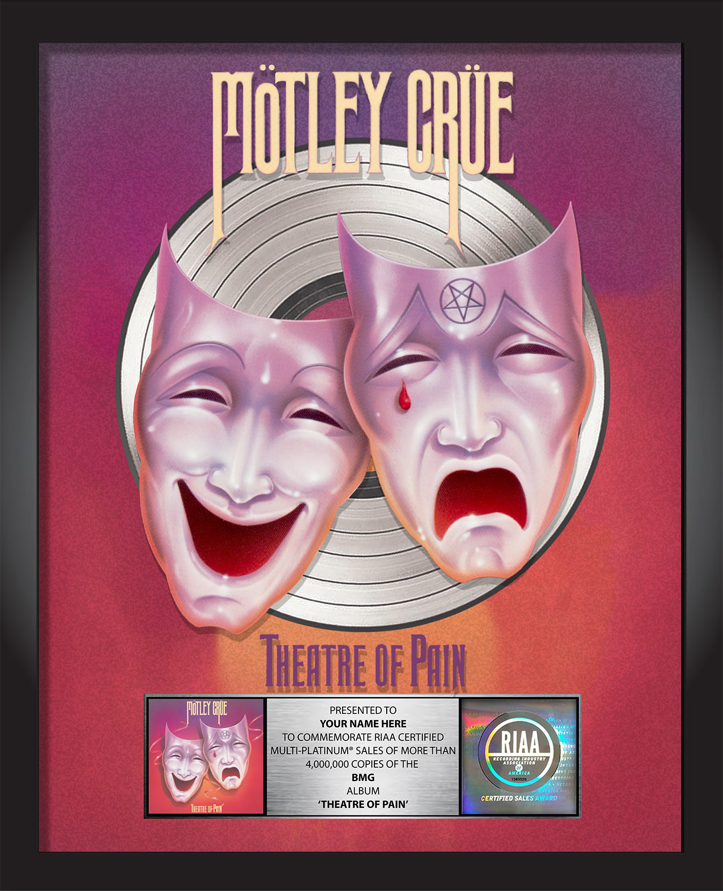 The official Mötley Crüe Crüeseum Exclusive hand signed 40th Anniversary RIAA certified Multi-Platinum sales plaque of the BMG album Theatre of Pain.